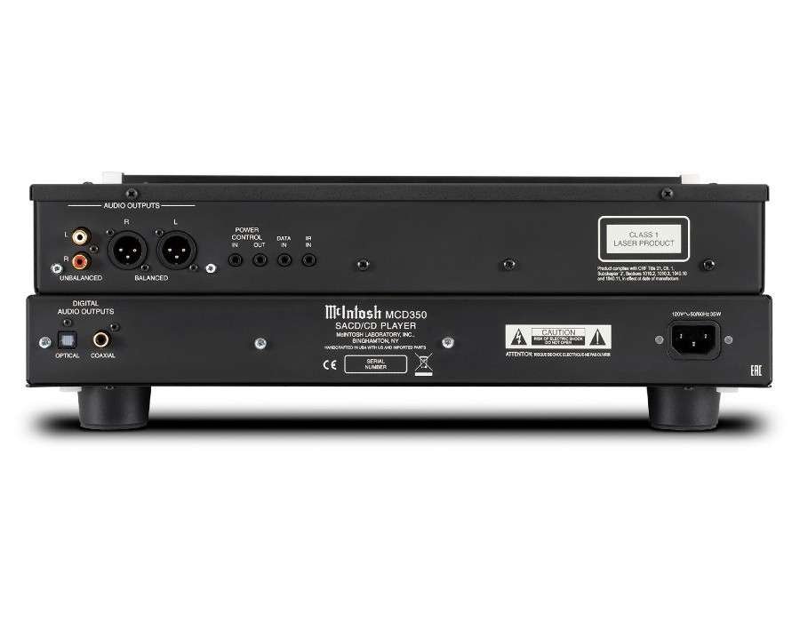 The MCD350 features 2x read speed so that all discs placed in its rigid aluminum die-cast tray are read at higher speeds allowing their data to be stored in a buffer memory for a better error correction and tracking. A twin laser optical pickup uses a single objective lens with two laser units each employing different wavelengths that are optimized for SACD and CD playback. The classic McIntosh black glass front panel with an illuminated logo and aluminum end caps complete the unit.